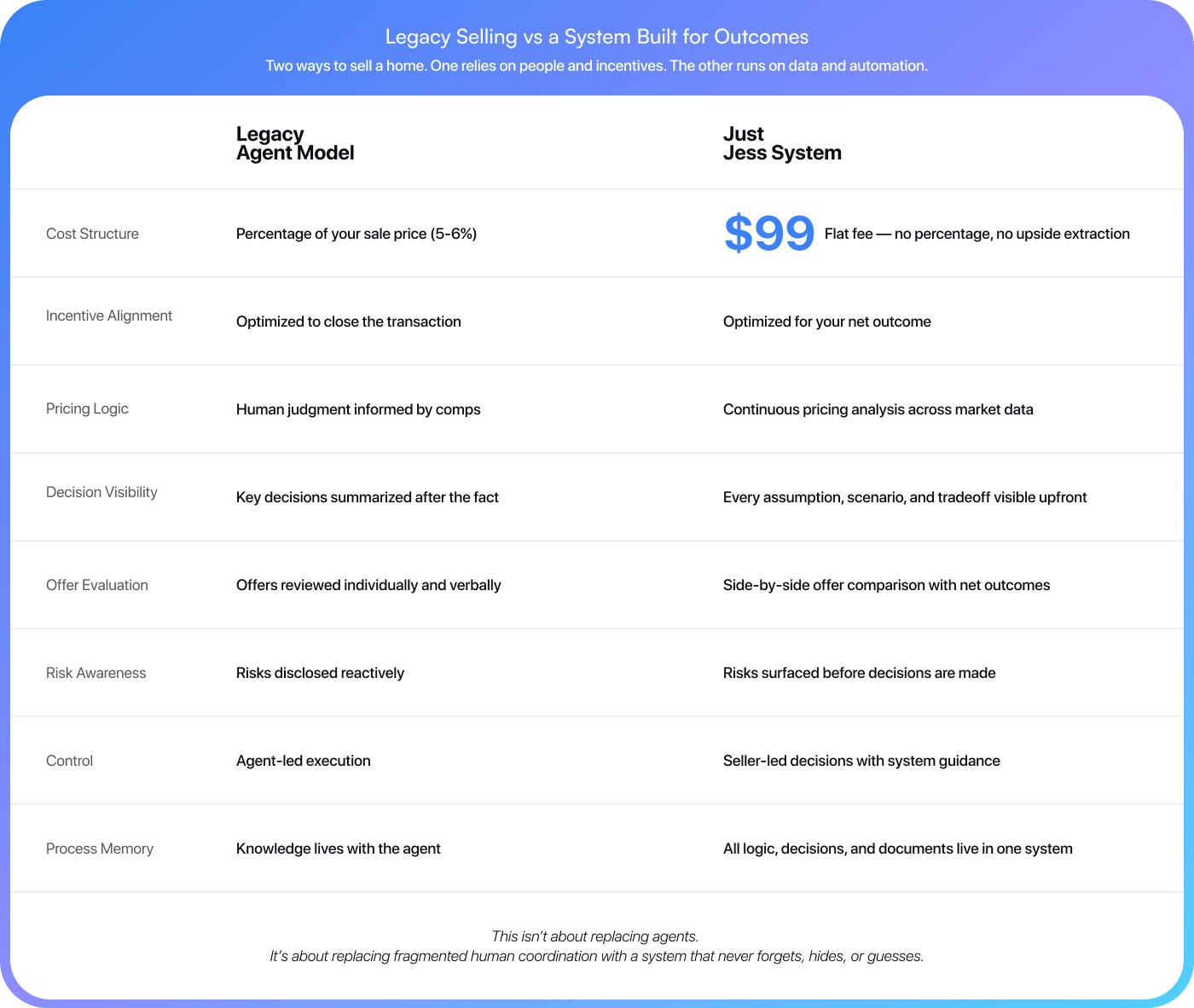 When someone is paid a percentage of your transaction, “bigger is better” — whether it’s right for you or not.Jess works differently. With a flat fee, there’s no pressure to stretch, upsell, or rush decisions. The goal is simple: protect your downside and help you make the best decision for you.